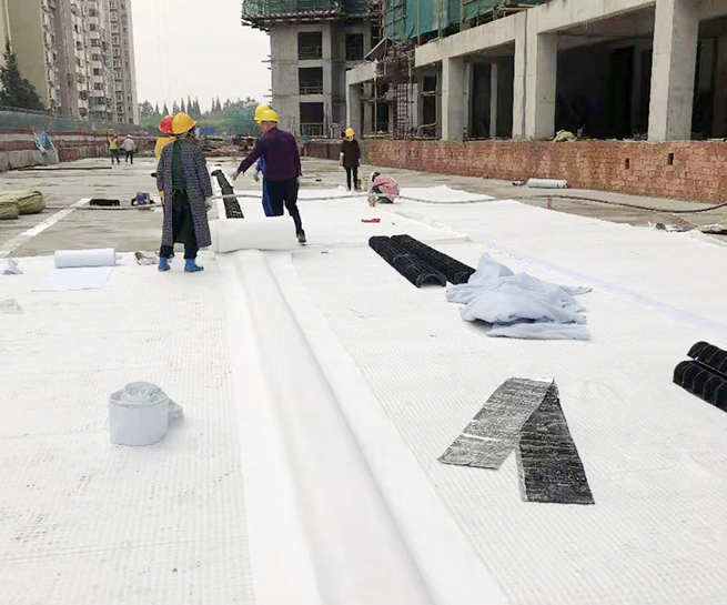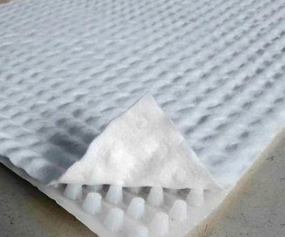 高分子防護排水異型片自粘土工布卷材是由高密度聚乙烯(HDPE)純白原料,在熔融狀態下經真空吸塑一次成型制成,制造出的單向連續密閉殼體型凸起的板狀材料,形成一種膜、殼連接,具有立+體排水空間和一定支撐剛度,液體、氣體可以在其內流動的防護排水卷材。